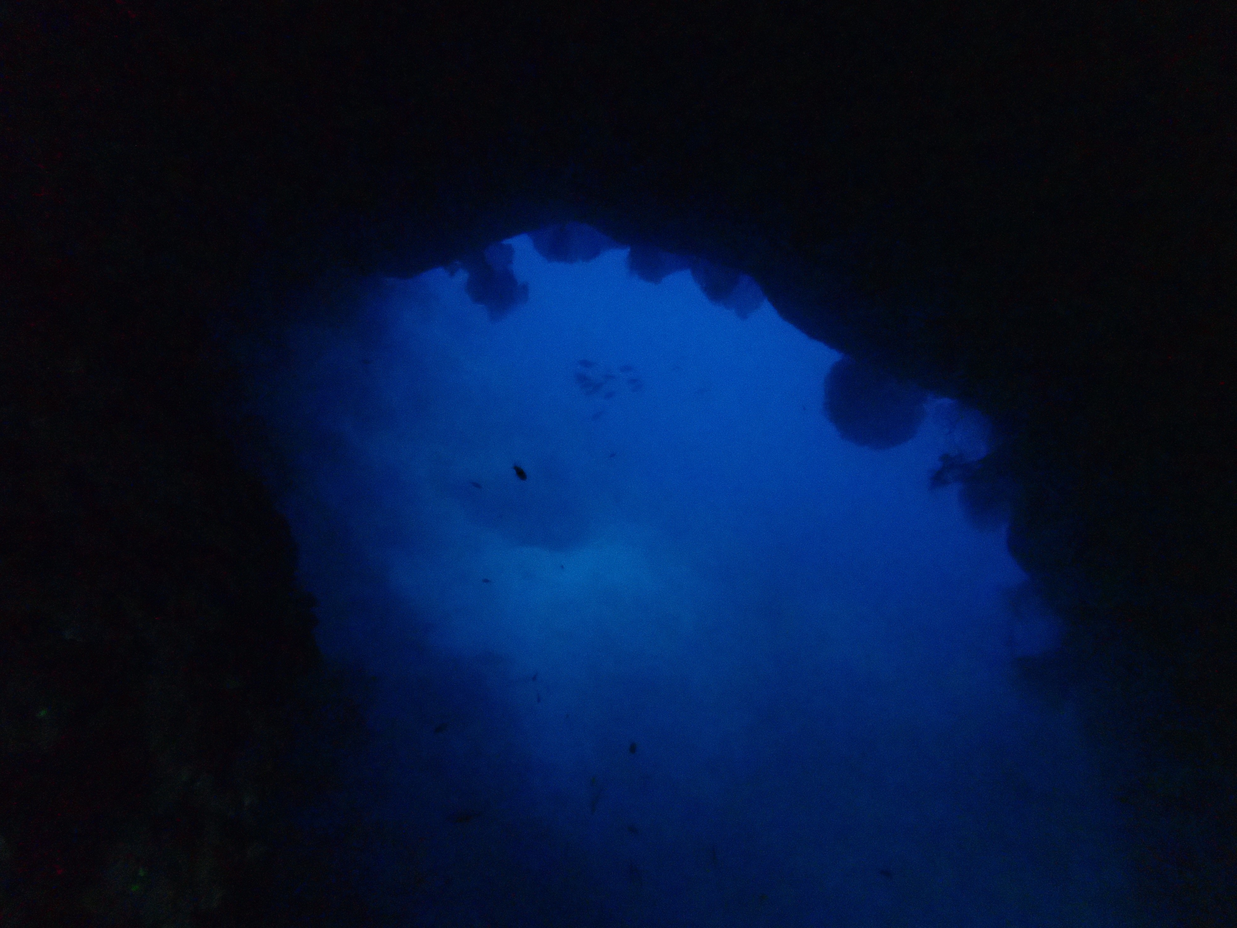 이 포인트는 쇼어 다이빙(Shore Diving)으로 입수합니다. 해변에서 장비를 착용한 뒤 얕은 수심의 리프 구간을 지나 수심이 깊어지는 슬로프를 따라 내려가면 동굴 입구가 나타납니다. 동굴 입구는 수심 약 18~24m 구간에 위치해 있으며, 내부는 넓은 홀 형태로 이루어져 있습니다. 동굴 안쪽으로 들어갈수록 수심은 더 깊어지고, 천장에서 빛이 들어오는 구간에서는 수면의 빛이 파란색으로 굴절되며 환상적인 분위기를 연출합니다. 이 빛의 효과 덕분에 수중 사진작가들 사이에서도 인기가 높은 포인트입니다.