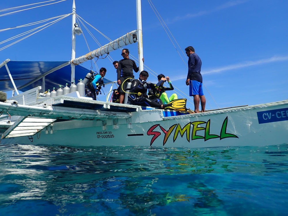맑고 푸른 하늘 아래, 오늘의 다이빙은 방카보트에서 시작됐다. 선명한 초록색 글씨로 **"SYMELL"** 이라고 적힌 필리핀 전통 목선 방카보트에 올라타 장비를 점검하는 순간부터 이미 설렘이 가득했다. 방카보트 위에서 다이버들이 BCD와 탱크를 착용하고 서로 장비 점검을 도와주는 모습은 어느 다이빙 여행에서나 볼 수 있는 익숙한 풍경이지만, 그 풍경 뒤로 펼쳐진 세부의 맑은 바다는 언제 봐도 가슴을 설레게 만든다.